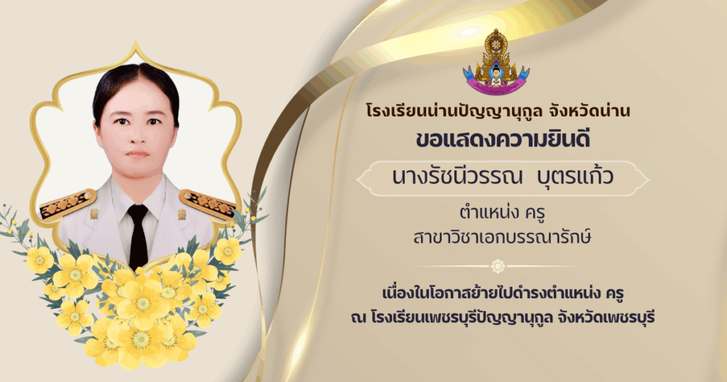 ขอแสดงความยินดี กลุ่มบริหารงานบุคคล ข่าวประชาสัมพันธ์ 28 Oct 2025 6 share tweet share นางรัชนีวรรณ บุตรแก้ว ตำแหน่ง ครู สาขาวิชาเอกบรรณารักษ์ ย้ายไปดำรงตำแหน่ง ครู ณ โรงเรียนเพชรบุรีปัญญานุกูล จังหวัดเพชรบุรี