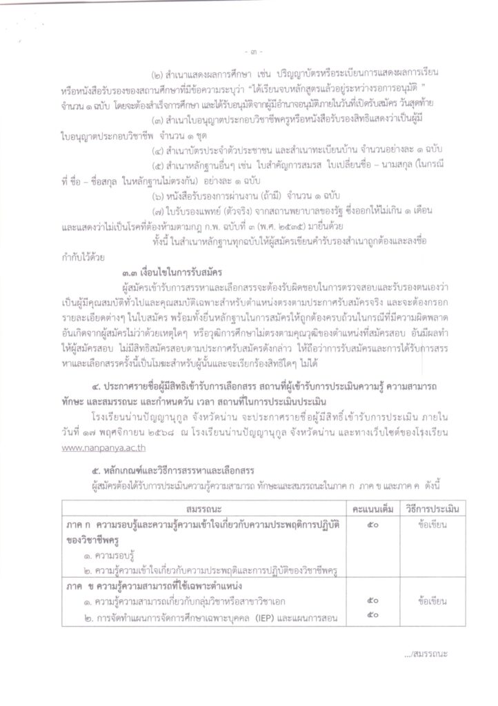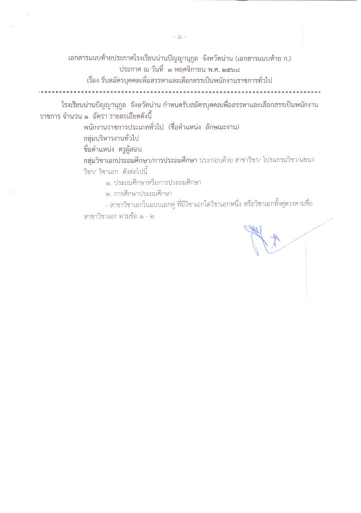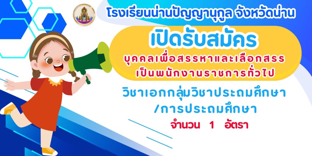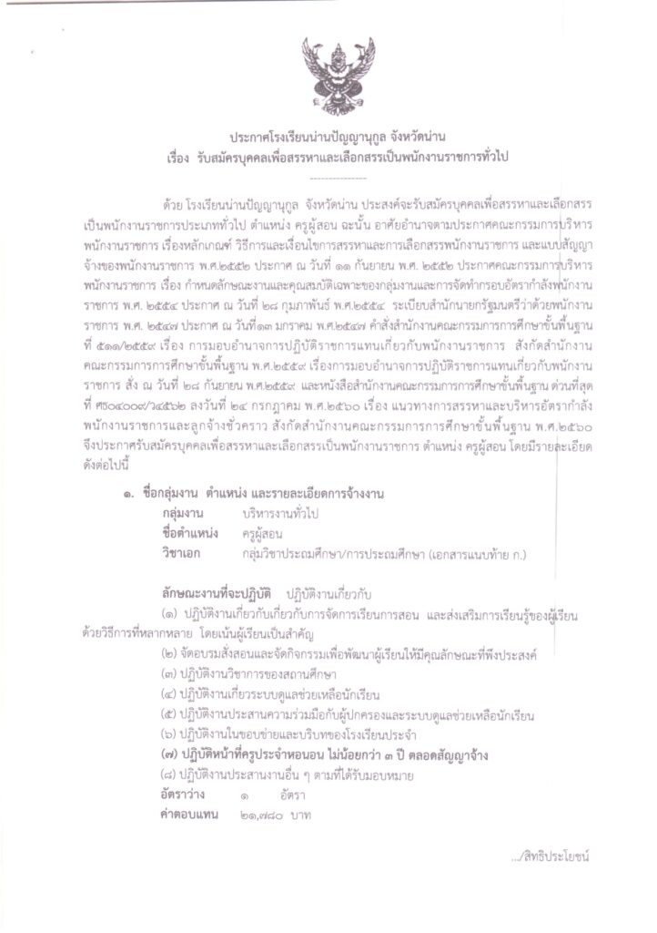 ประกาศโรงเรียนน่านปัญญานุกูล จังหวัดน่าน เปิดรับสมัครบุคคล เพื่อสรรหา และเลือกสรร เป็นพนักงานราชการทั่วไป วิชาเอกกลุ่มวิชาประถมศึกษา / การประถมศึกษา จำนวน 1 อัตรา รายละเอียดดังแนบ